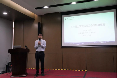 王教授針對大家在職業(yè)發(fā)展、人際交往等方面的壓力與困惑,從壓力探源、壓力調(diào)適、壓力管理等3個角度為職工講授了一堂生動有趣的心理健康知識講座,幫助員工進(jìn)行壓力情緒管理與心理健康維護(hù)。
